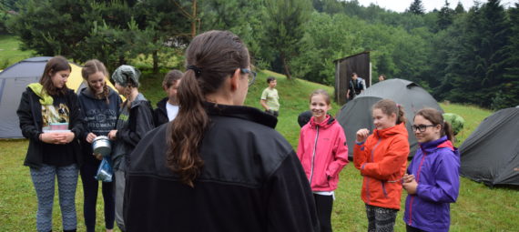 Słońce zniknęło już za horyzontem. Pierwszy dzień zlotu właśnie zakończył się. Uczestnicy szczęśliwie dotarli na polanę pod zamkiem. Zaraz po przyjeździe zajęli się rozstawianiem swoich namiotów. Każda drużyna bardzo dobrze poradziła sobie z tym zadaniem. Przygotowywali również obiad dla siebie i tworzyli elementy zdobnictwa obozowego. Mimo niesprzyjającej pogody, która sprawiła, że świat dokoła stał się szary i ponury to nasi harcerze byli pełni pozytywnej energii i chęci do dalszej pracy. Dzień zakończyliśmy wspólnym ogniskiem na zamku, podczas, którego słuchaliśmy gawędy druha komendanta, śpiewaliśmy piosenki i podziwialiśmy piękne, gwieździste niebo. Jutrzejszy dzień będzie pełen niezapomnianych wrażeń, dlatego z wielką niecierpliwością czekamy na nadejście nowego poranka.